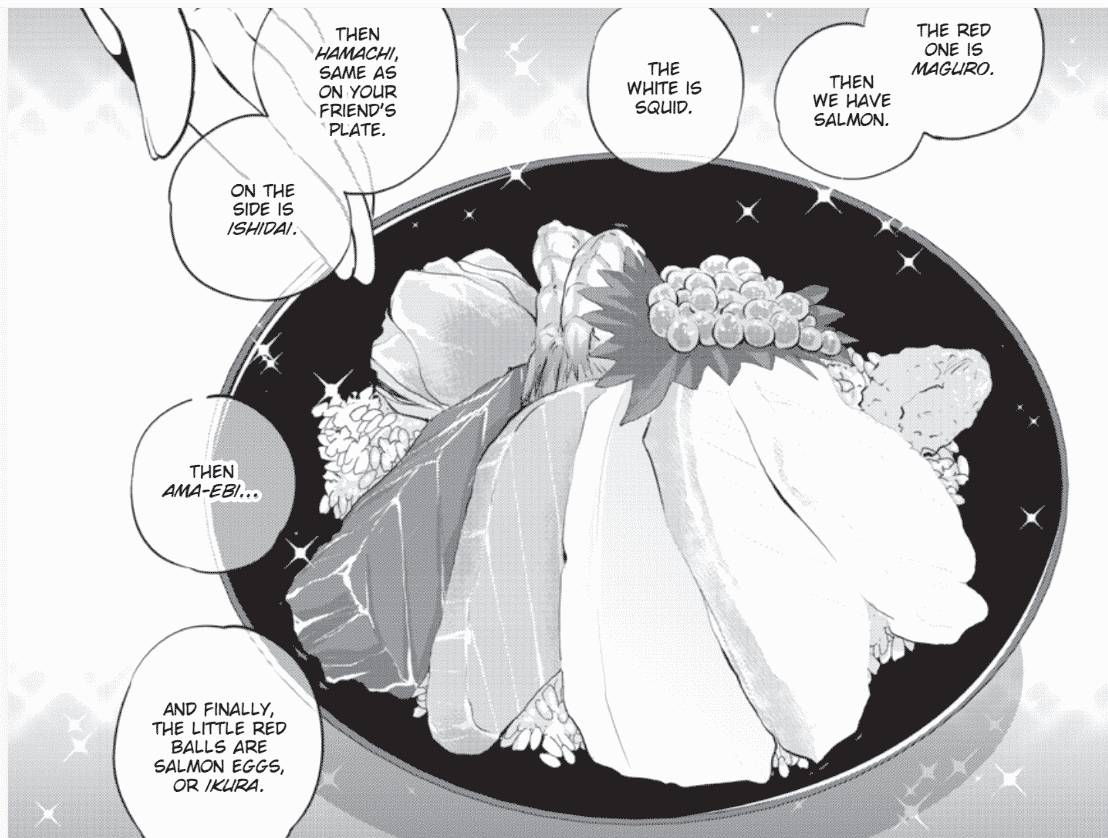 Another impressive accomplishment is making the food look so delectable in black and white. Confession: the thing that kept me from reading manga at first was I just couldn’t imagine how the stunning imagery Japanese art styles are known for could be nearly as impressive without color. I have long since learned that a skilled manga artist can give their audience plenty of splendor without the full rainbow. Nitōhei is definitely one of those artists. She recreates the visual beauty of each dish, making them look beautifully appetizing. Like every Nobu newbie, my worries for the food were quickly abated.