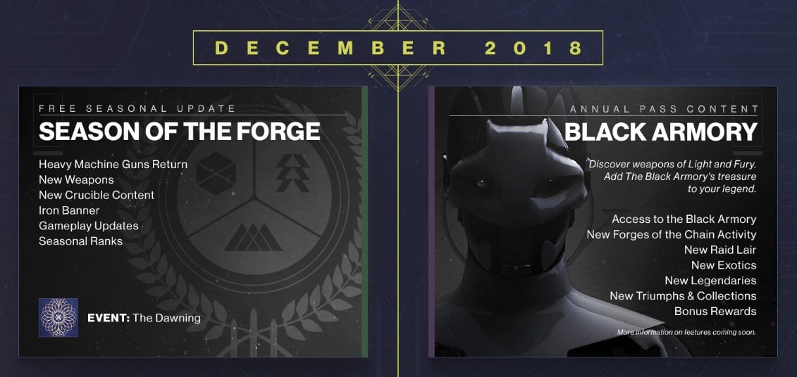 With Season 4: Season of the Outlaw set to end on November 27th, it’s becoming evident that Bungie is prepping to deploy Black Armory. This will be the first content expansion from the Forsaken Annual Pass. The only official time-frame we have is December 2018, and a December 4th release window has been rumored. If true, this places the release of Black Armory a week after the assumed start of Season 5: Season of the Forge.